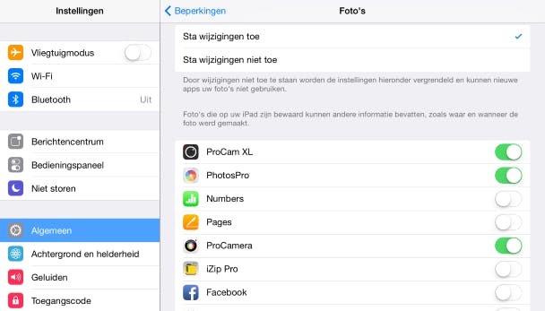 In dat geval kun je apps de toegang tot foto's ontzeggen. Zo kan je kind wel onbelemmerd fotograferen, maar blijven de beelden gewoon privé op de iPad. Je geeft aan welke apps wel en niet van foto's gebruik mogen maken via Instellingen / Algemeen / Beperkingen. Onder het kopje Privacy tik je op Foto's. Hier kun je bijvoorbeeld sociale netwerken zoals Twitter en Facebook de toegang tot foto's ontzeggen. Wil je liever dat een (jong) kind helemaal de camera niet gebruikt, dan kun je deze volledig deactiveren (zie tip 2 en 3).