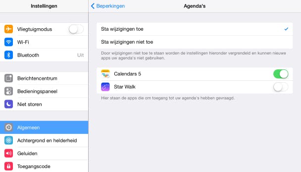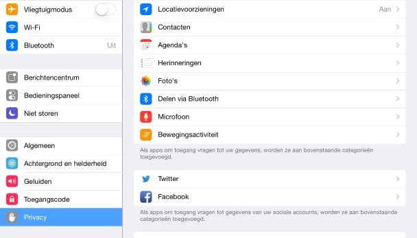 Een iPad bevat veel persoonlijke informatie. Ook kinderen krijgen immers contactgegevens van vriendjes, zoals telefoonnummers, adressen en e-mailadressen. Misschien houden ze ook al netjes een agenda bij, zodat precies te zien is wanneer ze waar zijn. Deze vertrouwelijke informatie kun je afschermen zodat niet alle apps erbij kunnen. Op deze manier beperk je waar deze gegevens mogelijk allemaal heengaan. Heb je een leuke agenda-app op de iPad gezet, dan mag die uiteraard wel gegevens over afspraken opvragen, want anders is de app niet te gebruiken.