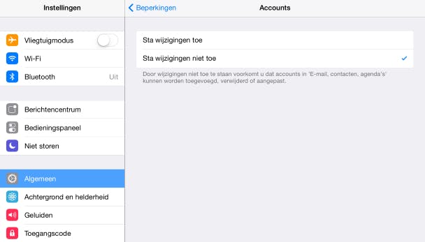 Wil jij zelf iets aanpassen, dan moet je eerst wijzigingen aan accounts toestaan door de beperking van daarnet tijdelijk op te heffen met Sta wijzigingen toe. De beperking geldt trouwens ook accounts van Berichten, FaceTime, Twitter, Facebook, Flickr, Vimeo en iCloud. Via Instellingen kunnen er dan geen accountgegevens worden aangepast.