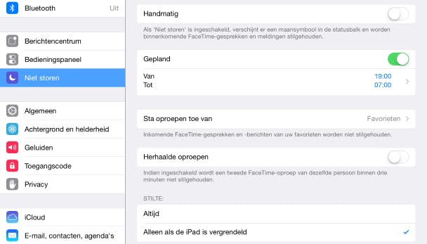 De verleiding is dan groot om stiekem het bed uit te glippen om te lezen wat er is binnengekomen (en snel een antwoordje in te tikken). Het geluid elke avond uit en 's morgens weer inschakelen is omslachtig. Het kan makkelijker via Instellingen / Niet storen. Gebruik Gepland om de periode aan te geven waarin het kind niet gestoord mag worden. Let wel, berichten komen wel op de iPad aan, ze worden alleen stilgehouden. Met Handmatig kan de iPad eventueel op een willekeurig moment het zwijgen worden opgelegd. Onderin kun je bij Stilte ook nog opgeven of de radiostilte alleen geldt als de iPad is vergrendeld, of ook als ermee gewerkt wordt.