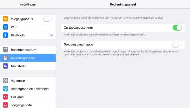 Een iPad heeft net als de iPhone een handig bedieningspaneel. Je tovert het tevoorschijn met een veeg vanaf de onderzijde van het scherm. Hierin kun je bijvoorbeeld wifi, bluetooth en de vliegtuigstand snel in- en weer uitschakelen, zonder steeds naar Instellingen te gaan. Ook Niet storen (zie tip 12) handmatig in en weer uitschakelen kan hiermee. Als kinderen lekker met de iPad bezig zijn en spelletjes spelen, is het alleen niet handig als dit bedieningspaneel te pas en te onpas tevoorschijn springt als ze over het scherm vegen. Voor je het weet schakelen ze per ongeluk allerlei dingen uit of juist in. Het is dan handiger om het bedieningspaneel te deactiveren als er met een app gewerkt wordt. Via het toegangsscherm is het dan nog wel bereikbaar, dus snel iets aan- of uitzetten blijft altijd mogelijk. Ga naar Instellingen / Bedieningspaneel en zet Toegang vanuit apps uit om dit te doen. Heb je liever dat het bedieningspaneel helemaal niet meer te gebruiken is, dan zet je Op toegangsscherm ook uit.