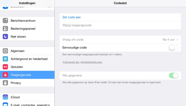 Heb je liever niet dat je kind zonder jouw toestemming of toezicht de iPad gebruikt? Stel dan een codeslot in, zodat de iPad niet ontgrendeld kan worden zonder deze code. Via Instellingen / Toegangscode schakel je een toegangscode in. Kies eerst voor Zet code aan en stel een toegangscode in. Geef bij Vraag om code aan na hoeveel tijd inactiviteit van de iPad erom gevraagd moet worden. Dat kan direct zijn, of na een vertraging van een minuut tot vier uur. Schakel Eenvoudige code uit als je liever geen cijfercode instelt maar bijvoorbeeld een woord wilt gebruiken. Wellicht is dat voor je kinderen minder makkelijk te raden.