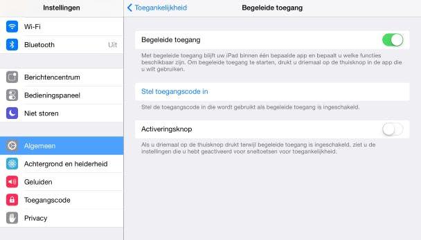 Stel dat je een onwijs leuke app hebt gevonden voor je kind, maar je hebt geen specifieke kinder-iPad in huis. Je kunt uiteraard je eigen iPad geven, maar dan heeft een kind toegang tot alle apps en al jouw gegevens. Wat nu? Daar heeft Apple iets slims voor bedacht. Je kunt iemand namelijk één app laten gebruiken, terwijl de rest van de iPad volledig onbereikbaar is. Deze functie schakel je in bij Instellingen / Algemeen / Toegankelijkheid. Blader omlaag en tik bij Leren op Begeleide toegang. Zet de optie Begeleide toegang aan en stel een toegangscode in.