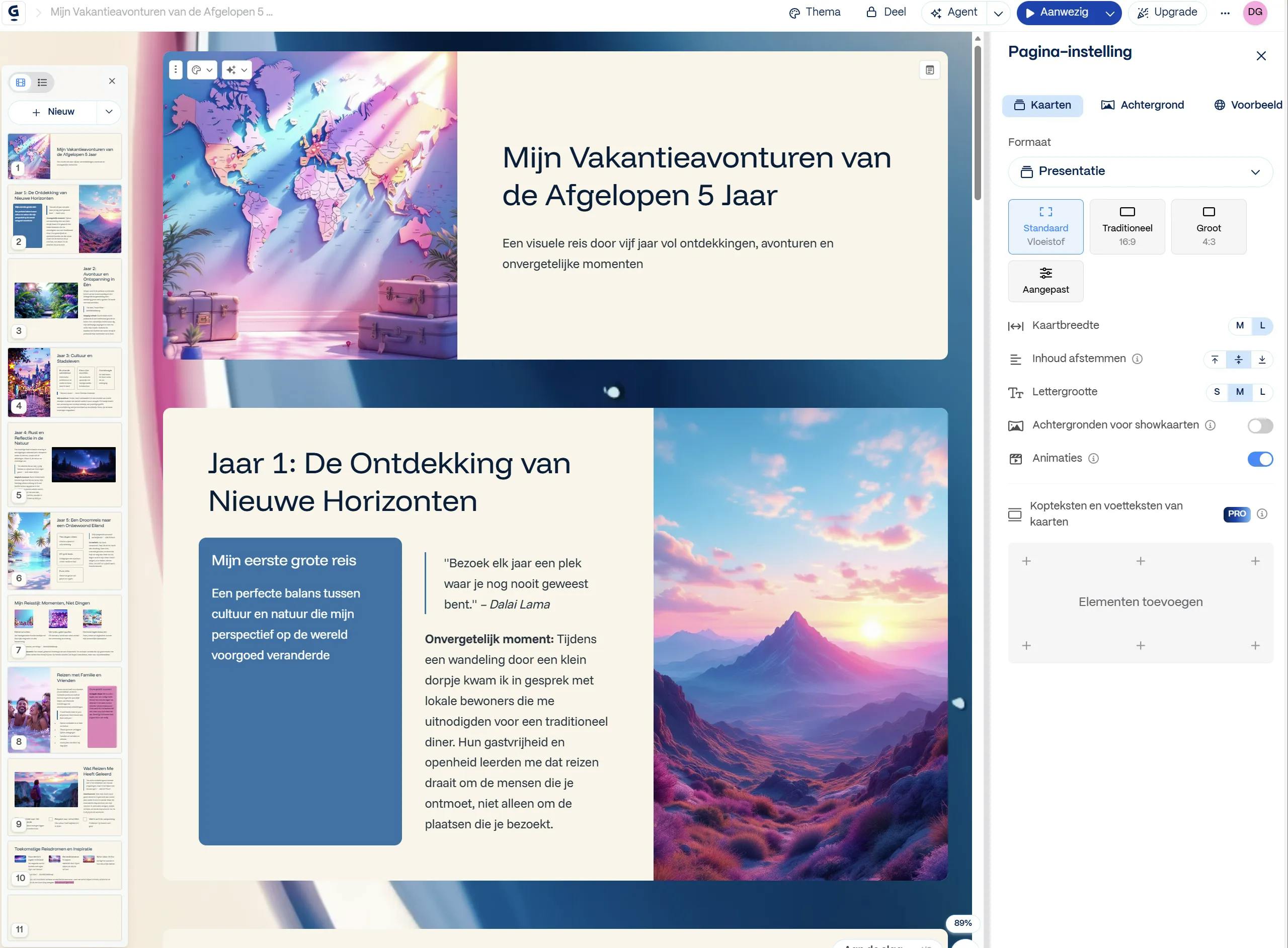 Nadat Gamma de presentatie heeft gegenereerd, kun je het bestand verbeteren, wederom met een slim gebruik van AI. Gebruik het chatvenster rechts om extra opdrachten op te geven. Denk bijvoorbeeld aan ‘Verplaats alle afbeeldingen naar links’, ‘Zoek naar typfouten en grammaticafouten’ en ‘Verminder de hoeveelheid tekst op kaart 5’. Onder Snelle bewerkingen vind je veelvoorkomende prompts die je typwerk kunnen besparen. Denk aan ‘Een samenvatting toevoegen’, ‘Een thema aanbevelen’ en ‘Kaarten met veel tekst visualiseren’.