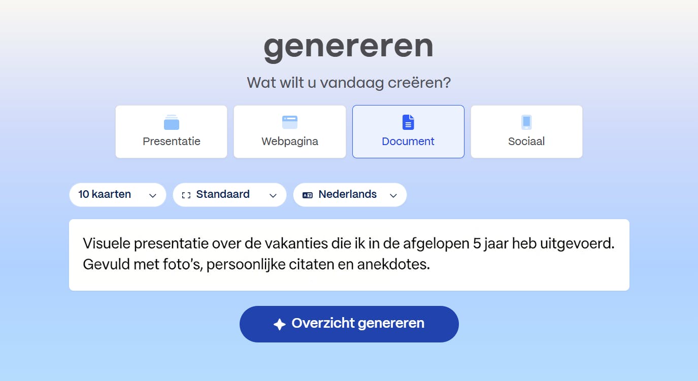 We beginnen met het genereren van een nieuw document. Klik op de bijbehorende knop Genereren. Hoewel de nadruk ligt op het maken van presentaties, kun je met Gamma ook een webpagina, document of post voor sociale media maken. Selecteer bovenin het materiaal dat je wilt maken, bijvoorbeeld Presentatie. Afhankelijk van het materiaal verschijnen in de rij eronder subopties. Zo zie je bij Presentatie en Sociaal het submenu Ontwerpmodus voor kaarten. Hier bepaal je de indeling van een kaart. Een kaart is een slide of dia, zoals je uit PowerPoint en Keynote kent.