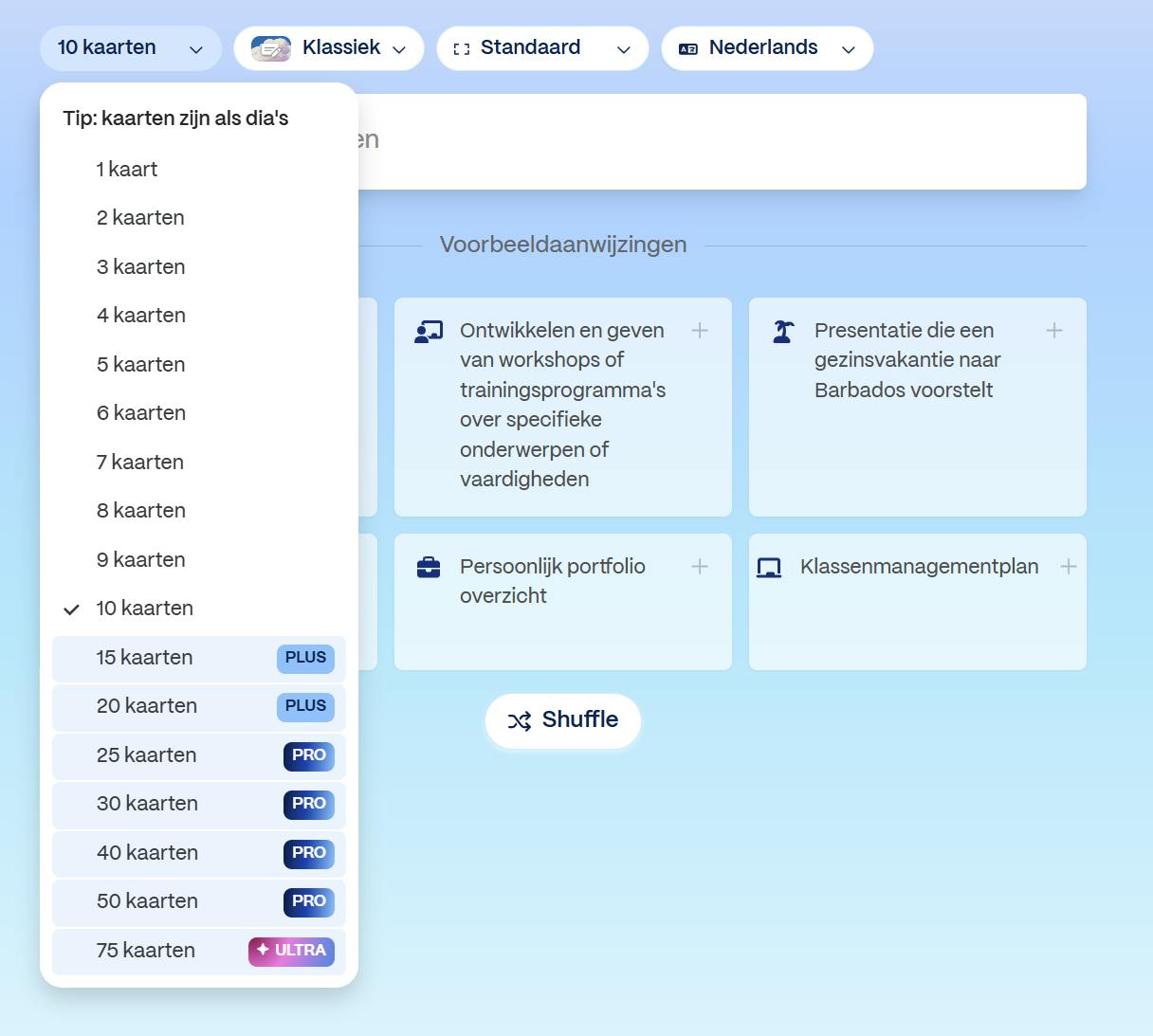 Kies het aantal kaarten, bijvoorbeeld 10 kaarten (lees het kader ‘Gratis en betaald’ voor informatie over het aantal kaarten). Klik hierna op Standaard om het kaartformaat aan te passen. Je kunt kiezen tussen een flexibel formaat (dit is standaard geselecteerd), maar ook voor 16:9 (kies Traditioneel) of 4:3 (kies Groot). Uiterst rechts vind je de optie voor het kiezen van de taal: wij kiezen Nederlands.