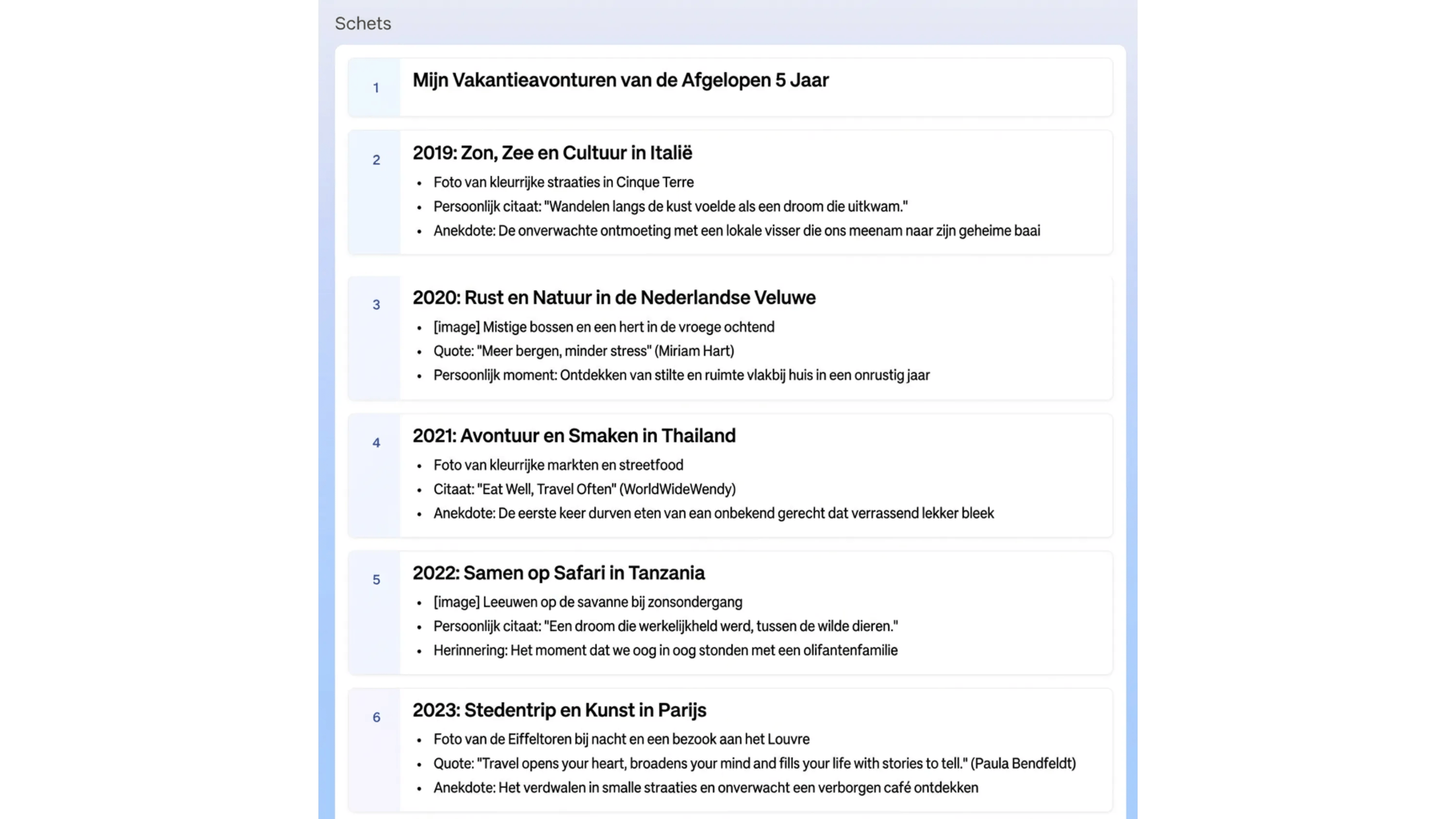 Ben je tevreden? Klik op Overzicht genereren. Gamma maakt nu een schets: dit is een opzet op hoofdlijnen, waarin we zelf nog aanpassingen maken. Vul nu per kaart in de sectie Schets de gewenste inhoud in. Klik op Kaart toevoegen als je meer informatie in de presentatie wilt verwerken.