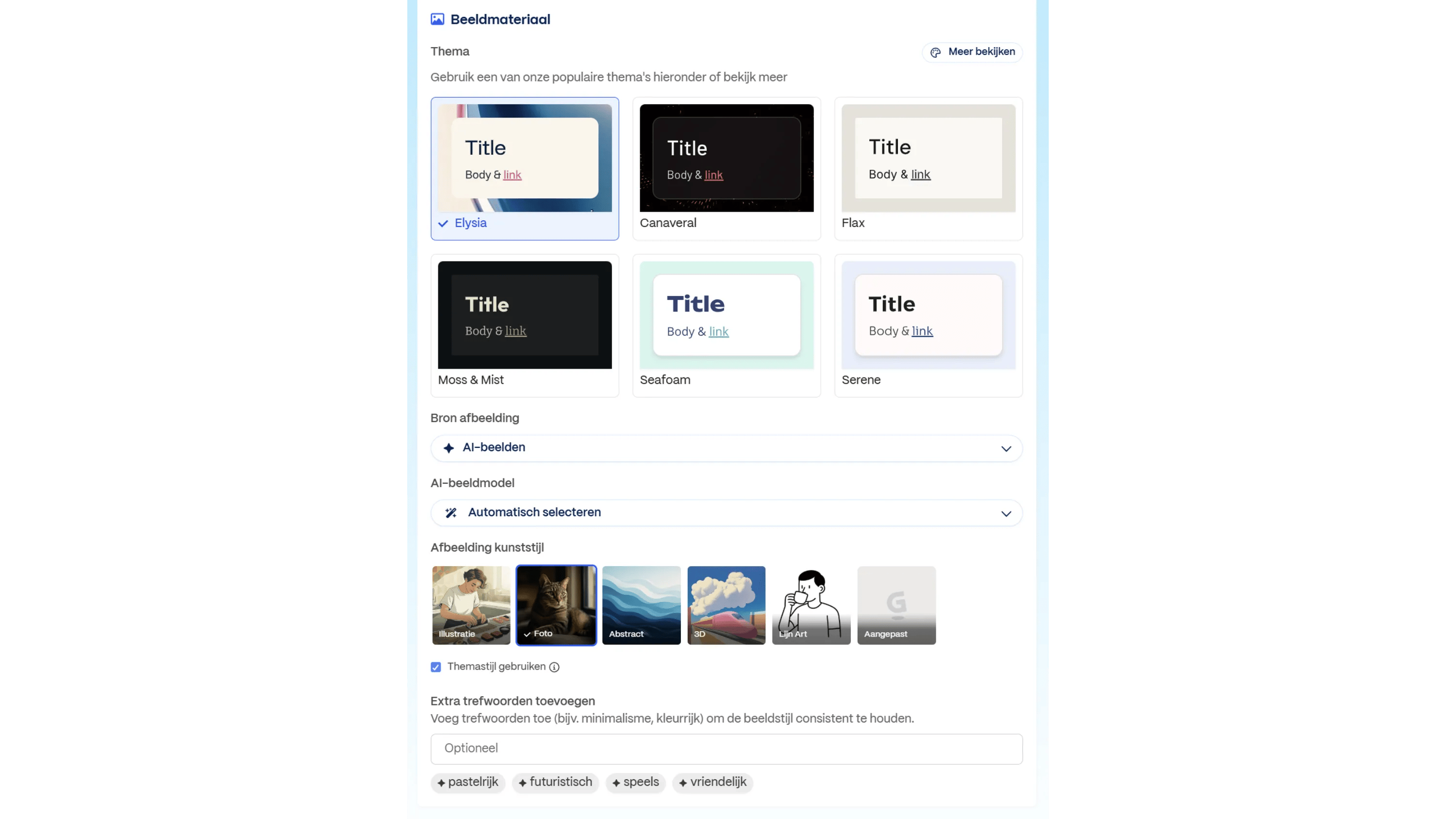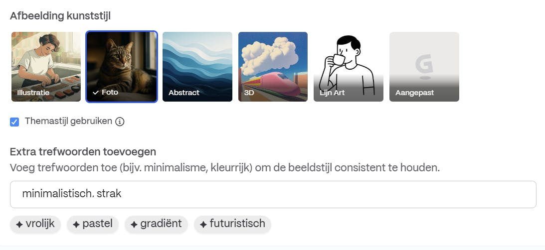 In de sectie eronder kies je welke stijl de afbeelding moet hebben. Standaard kiest Gamma voor Foto, maar je kunt ook kiezen voor getekende afbeeldingen (zoals Illustratie of Lijn Art). Voor nóg meer controle kies je Aangepast: hiermee open je een nieuw promptveld waarin je een prompt voor een specifieke stijl kunt opgeven. Beschrijf de stijl zo concreet mogelijk, bijvoorbeeld: ‘Minimalistisch’. Welke stijl je ook kiest, je kunt deze consistenter maken via de optie Themastijl gebruiken. Gamma brengt de afbeeldingen dan in lijn met het eerder gekozen thema. In het onderste vak kun je aanvullende trefwoorden voor de stijl opgeven (bijvoorbeeld ‘luxueus’, ‘strak’ of ‘minimalistisch’).