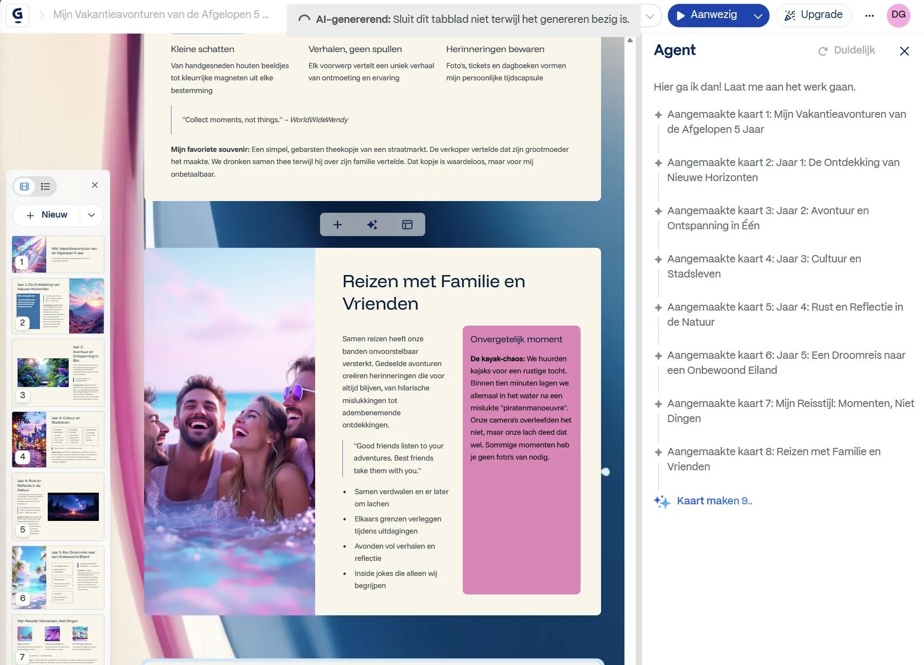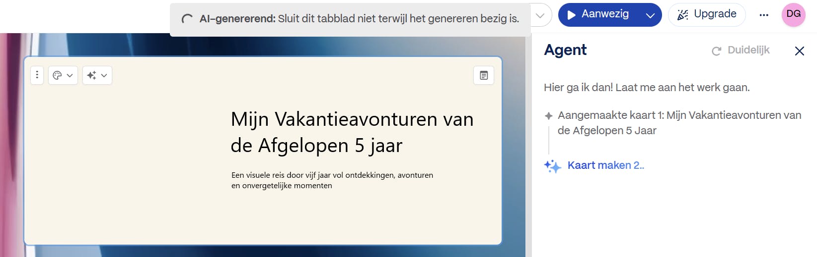 Linksonder in het venster lees je hoeveel credits je nog hebt. Heb je de input nagelopen en ben je tevreden, dan klik je op Genereren om de presentatie te maken. Gamma maakt de presentatie. Afhankelijk van de grootte kan dit een paar minuten duren. Rechts vind je het statusvenster van de AI-agent. Deze houdt je van de voortgang op de hoogte. Links wordt het resultaat getoond.