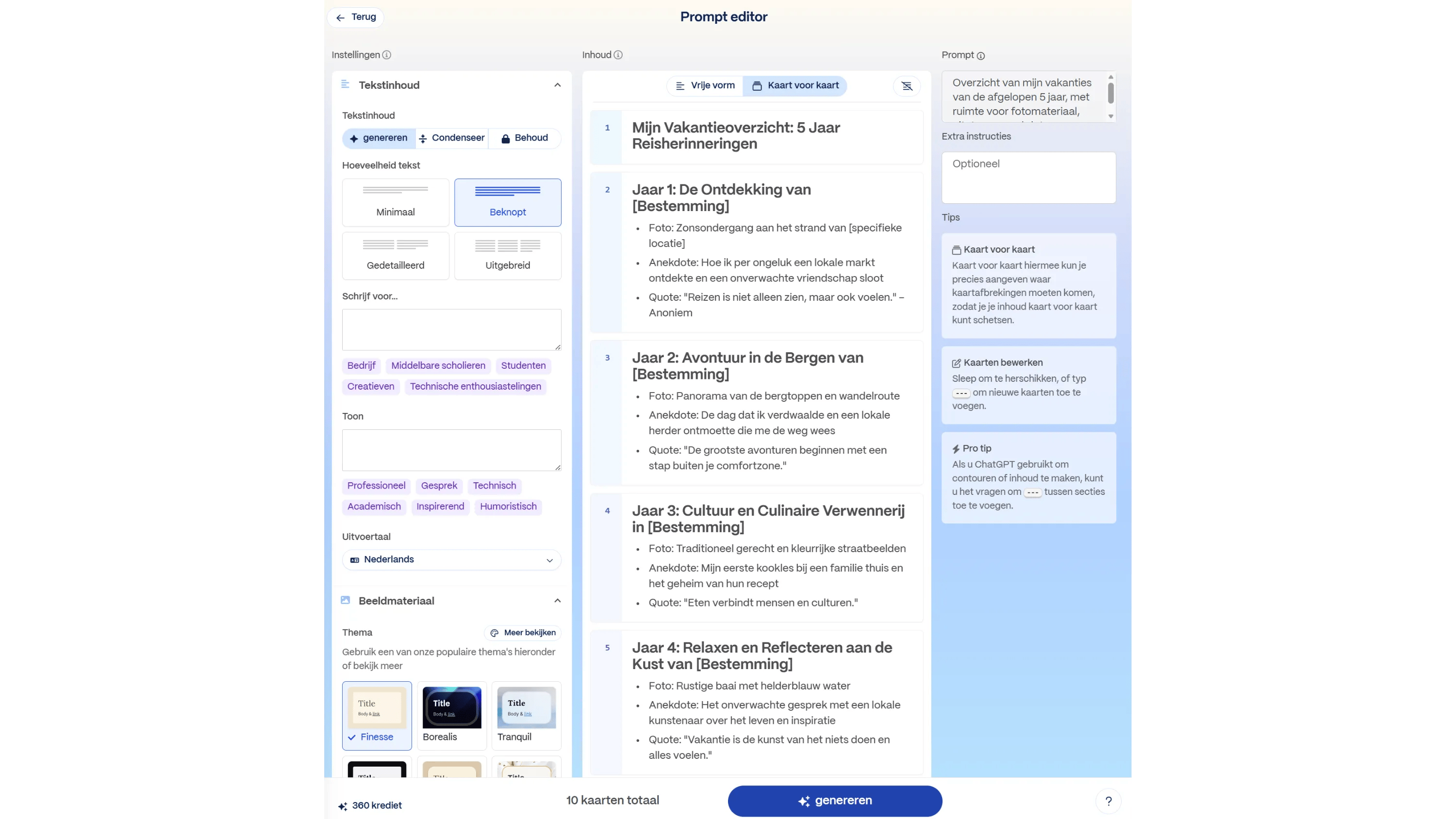 Als je de smaak te pakken hebt, kun je het maken van presentaties versnellen via de geavanceerde modus. Je vindt die optie onderin het scherm, vlak boven de knop Genereren. De geavanceerde modus geeft je toegang tot de prompteditor. Dit venster verzamelt alle inputvelden in één overzicht, waarmee je de presentatie snel kunt opbouwen. Onderin het venster lees je uit hoeveel tokens de presentatie bestaat. Dit geeft je een goede indicatie van de grootte van de presentatie: Gamma geeft ook aan uit hoeveel tokens de presentatie maximaal mag bestaan.