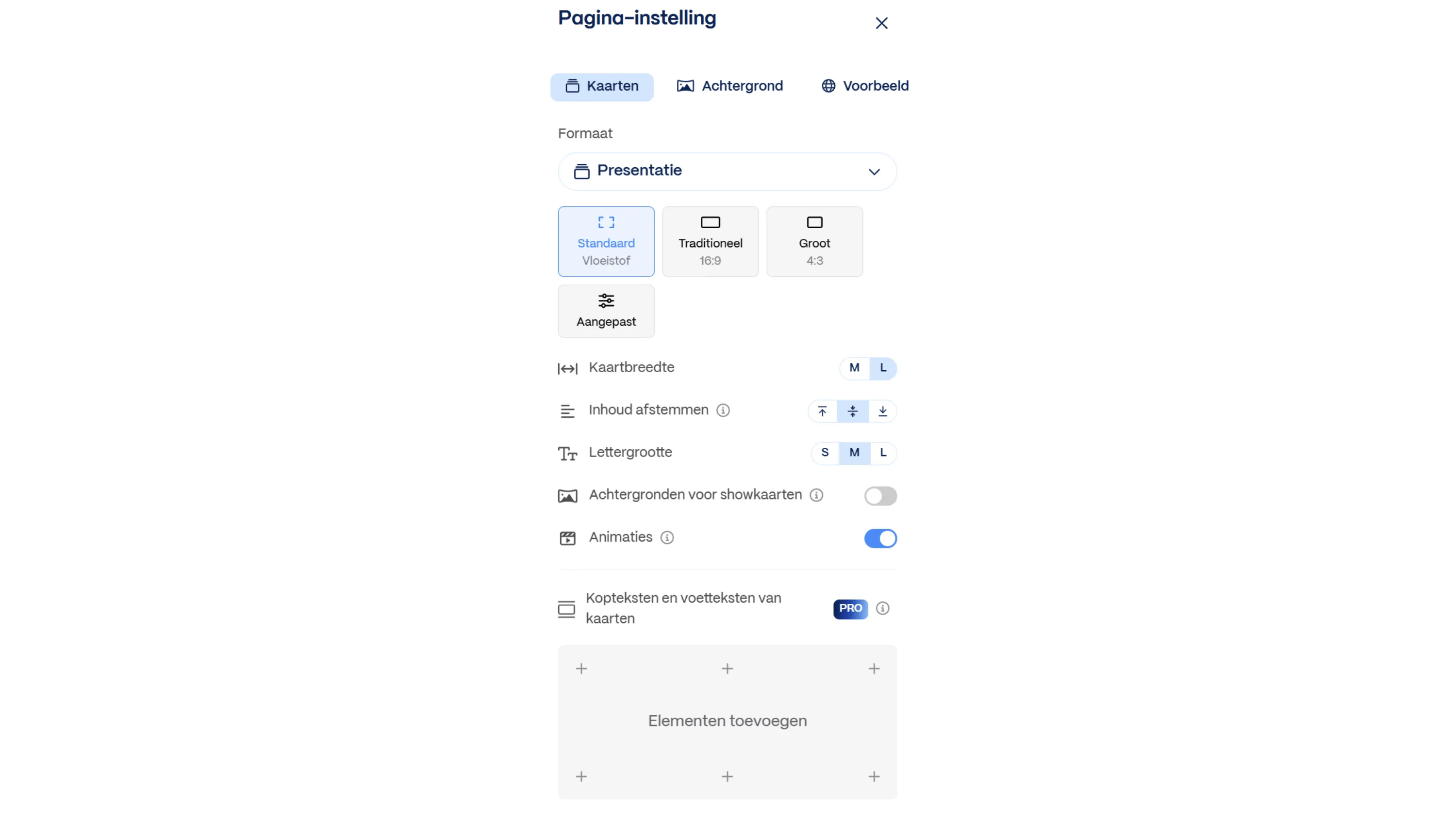 Pas de eigenschappen van de kaarten aan als je hierover nog niet tevreden bent. Klik op de knop met de drie puntjes (...) en kies Pagina instellen. Geef de verhoudingen aan via de knoppen bovenin. Daaronder kun je detail-eigenschappen opgeven, bijvoorbeeld de lettergrootte van elke kaart, de kaartbreedte en de achtergrond. Klik op de tab Voorbeeld om je wijzigingen in de praktijk te zien.