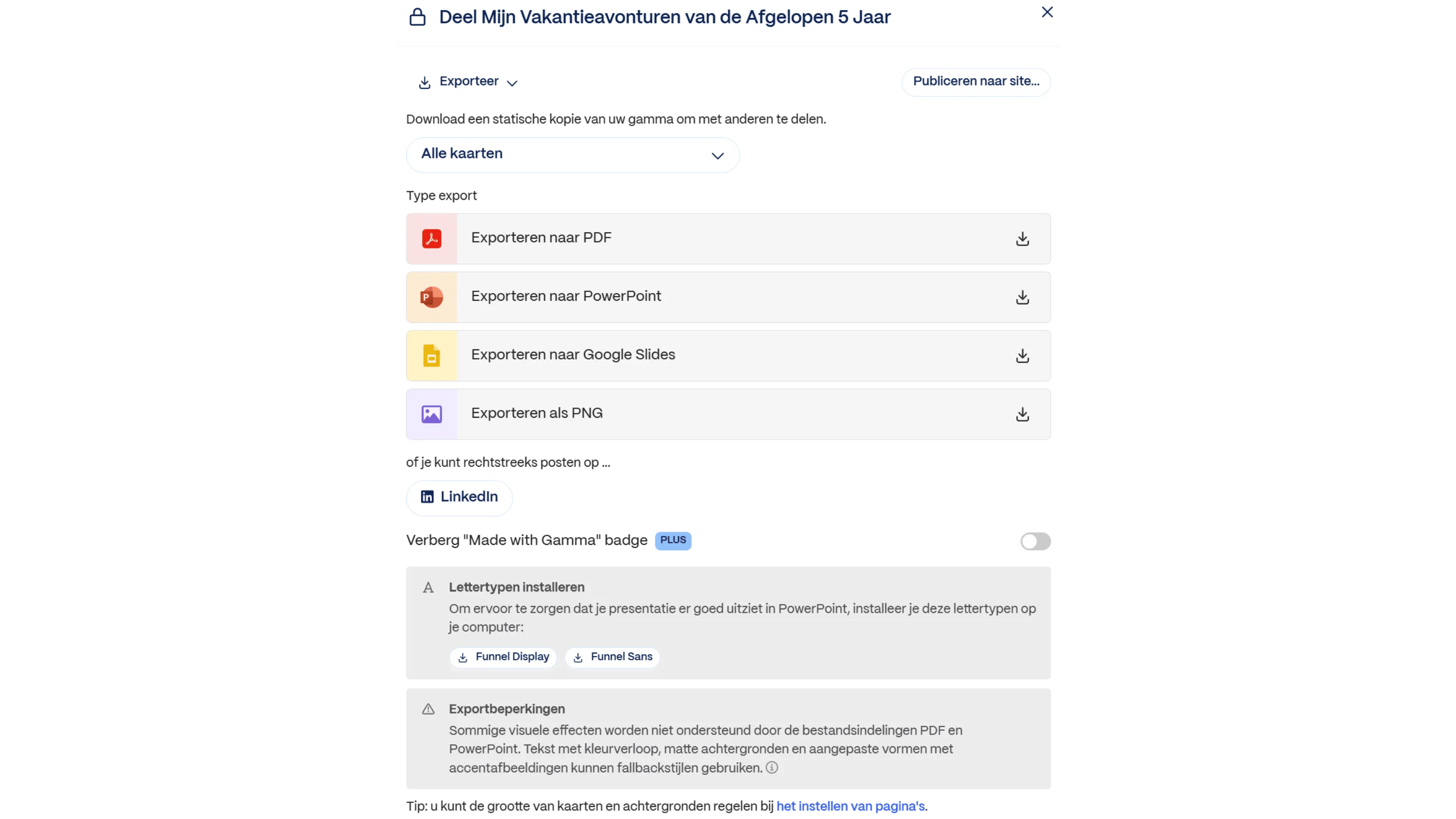 Gamma kent een volwassen set exporteerfuncties. Uiteraard kun je de presentatie afspelen in de Gamma-omgeving zelf. Klik bovenin op de pijl naast de knop met het Afspelen-logo en kies hoe je de presentatie wilt tonen: In dit tabblad, Volledig scherm of Weergave presentator (waarbij je tijdens de presentatie notities kunt bekijken). Vaak zul je de presentatie exporteren. Klik op de knop met de drie puntjes (...) rechtsbovenin en kies Exporteren. Onder Type export kies je het gewenste formaat. Je kunt de Gamma-presentatie exporteren als pdf-bestand, maar ook als PowerPoint- en Google Slides-presentatie. Ook kun je de presentatie als png-afbeeldingen exporteren.