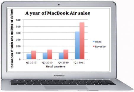 Via de site 'MacRumors zijn verkoopcijfers gepubliceerd van de MacBook Air. Uit de cijfers blijkt dat sinds de update in 2010 de Air's als warme broodjes over de toonbank gaan. Het aantal verkochte Air's is in het afgelopen kwartaal 333% hoger dan vorig jaar rond dezelfde tijd.