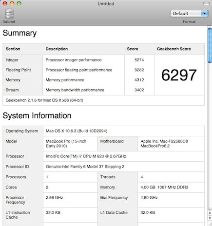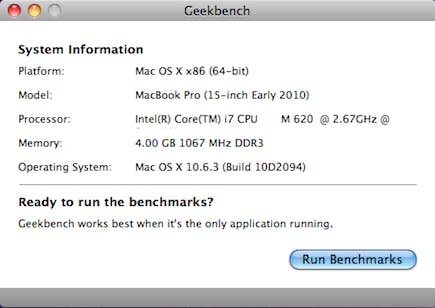 Een MacBook Pro kost wat, maar daar krijgt u ook wat voor terug. We onderwierpen het vorige model MacBook Pro van een paar maanden oud en de vernieuwde versie met een Core i7-processor aan de synthetische benchmark GeekBench en zagen de score vooruit springen van 3902 naar een duizelingwekkende 6297. Op de website van GeekBench kunt u deze prestaties vergelijken met uw systeem of laptop. GeekBench vergelijkt systemen onafhankelijk van het besturingssysteem.