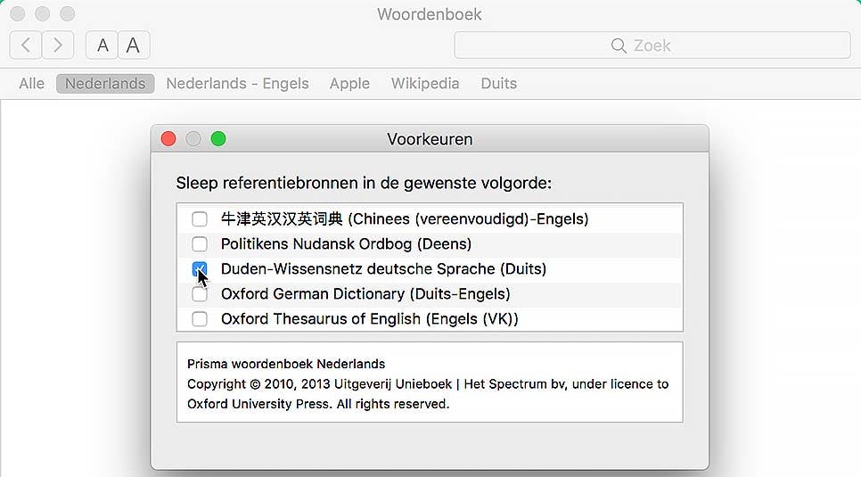 De werking van Woordenboek spreekt voor zich. Tik een woord in het zoekveld en kies een van de beschikbare woordenboeken. Of ga voor Alle en je krijgt een lijst van 'hits' uit alle woordenboeken, inclusief Wikipedia. Mocht je behoefte hebben aan andere woordenboeken, dan zijn er meer te activeren in het programma. Klik daarvoor in de menubalk op Woordenboek en dan op Voorkeuren. Selecteer vervolgens de beschikbare exemplaren. Desgewenst is de volgorde te veranderen door het slepen van woordenboeken; de volgorde wordt weerspiegeld in de volgorde van de knoppen in de menubalk van het programma.