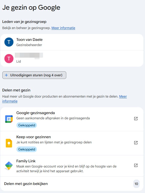 Google biedt voor gezinnen een functie waarmee automatisch een familieagenda wordt aangemaakt. Dit stel je als volgt in. Meld je aan op https://families.google.com en klik op +Uitnodigingen sturen (nog 5 over). Vul één of meer namen of e-mailadressen in en bevestig met Verzenden. Wil je ook kinderen jonger dan 13 toevoegen, dan moet je als gezinsbeheerder eerst een Google-account met ouderlijk toezicht voor het kind aanmaken. Meer informatie hierover vind je op www.kwikr.nl/got.