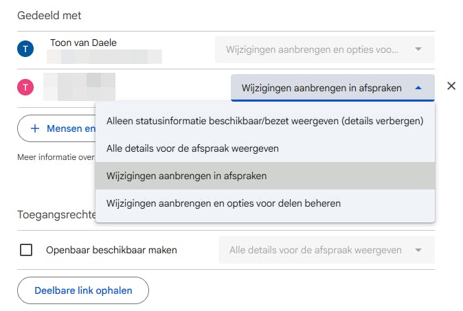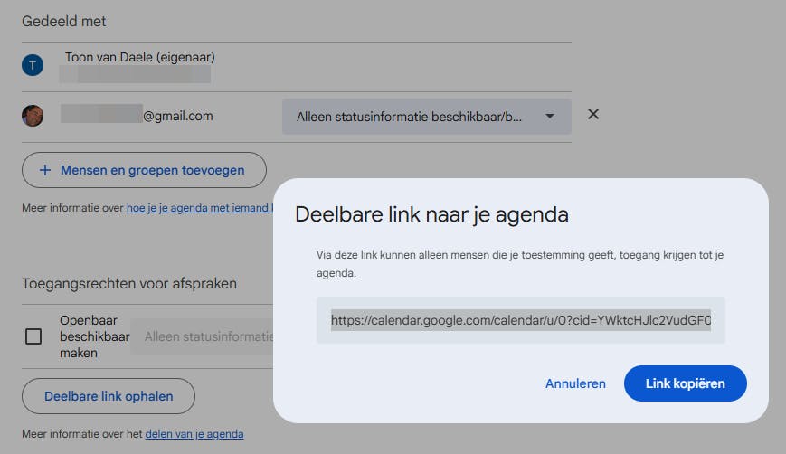 Deelbare link ophalen is enkel bruikbaar voor mensen met een Google-account en geeft geen iCal-feed. De machtigingen volgen wat je bovenaan bij Mensen en groepen toevoegen hebt ingesteld.