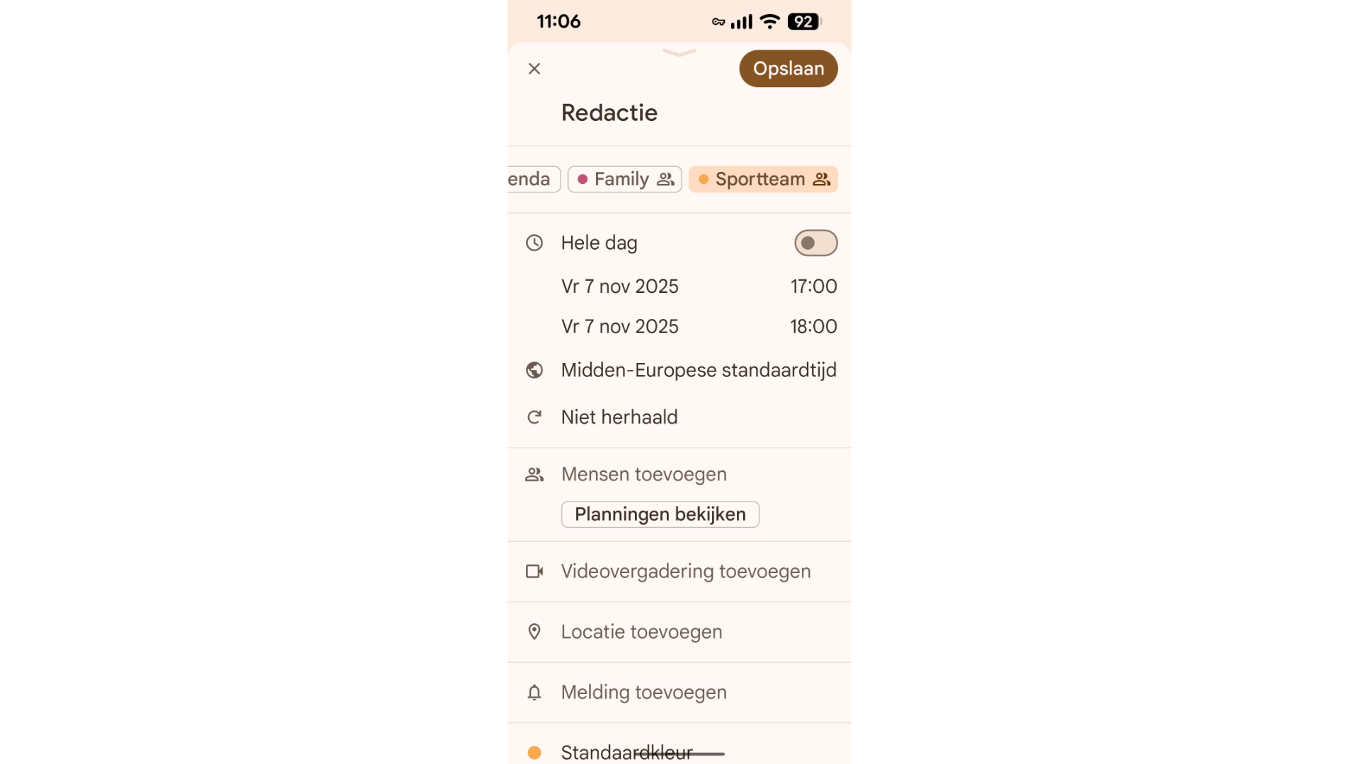 Google Agenda maakt het ook eenvoudig om een willekeurige agenda te delen met andere Google-gebruikers. Vanuit de mobiele app kun je vooralsnog geen volledig nieuwe, lege agenda aanmaken, maar dat kan wel via de webapplicatie (https://calendar.google.com). Klik in het linkerdeelvenster bij Andere agenda’s op het plusknopje en kies Nieuwe agenda maken. Vul een naam in, zoals Gezin van Paemel of Sportteam, voeg een omschrijving toe en kies je tijdzone. Bevestig met Agenda maken; de agenda verschijnt bij Mijn agenda’s in het linkerdeelvenster.