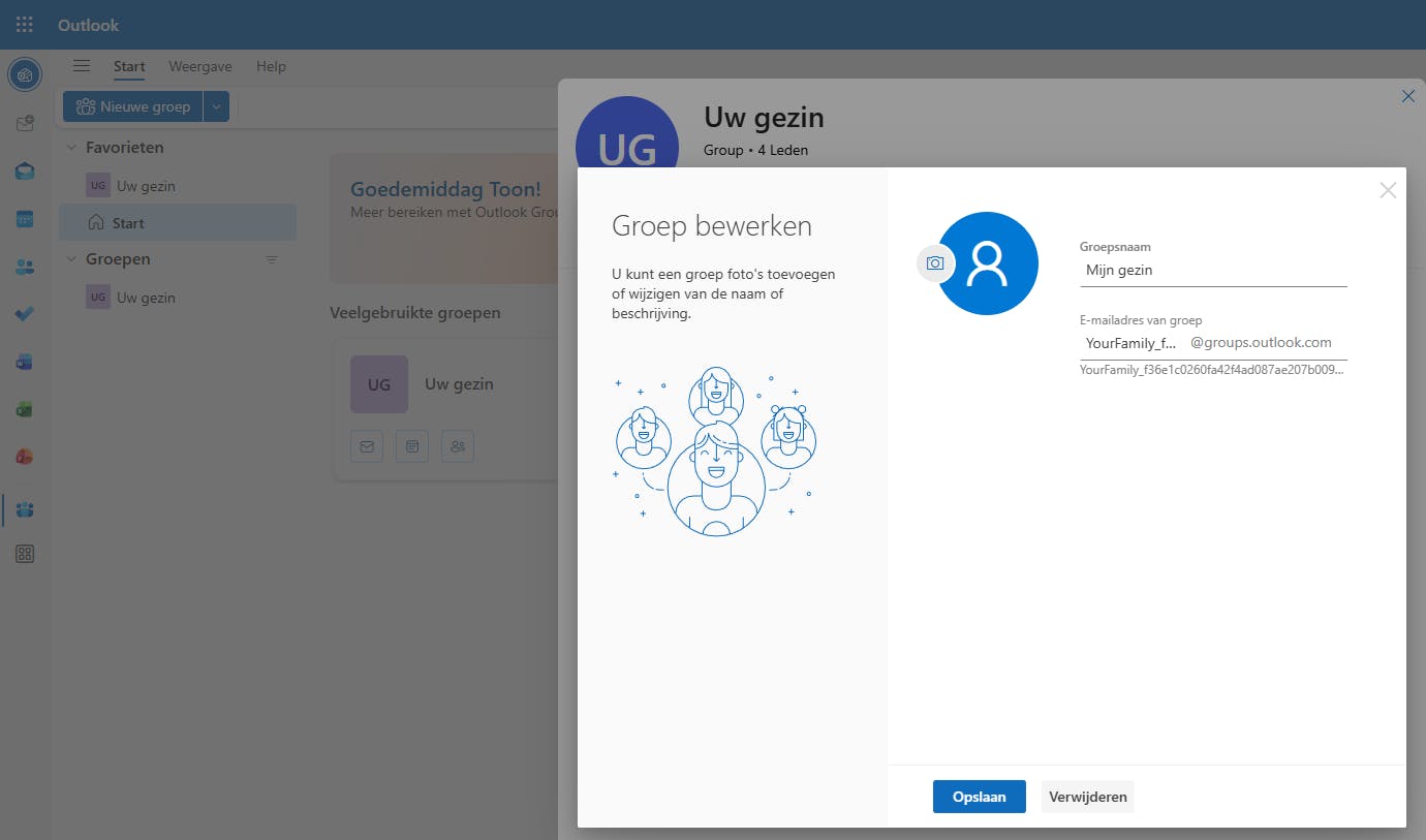 Op www.outlook.com vind je de agenda bijvoorbeeld in het linkerdeelvenster onder Groepen, bij Your family of Uw gezin. Wil je de naam wijzigen, open dan de rubriek Personen, klik op Ga naar groepen en vervolgens op Your Family. Kies Groep bewerken, pas de naam aan en bevestig met Opslaan. Dit is een handige optie voor gezinnen die al binnen het Microsoft-ecosysteem werken, al vinden we Googles manier iets gestroomlijnder.