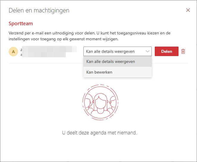 Voeg daarna de gewenste leden toe. In de webversie klik je op de drie puntjes bij de agenda, kies je Instellingen en delen en vervolgens Mensen en groepen toevoegen. In de mobiele app kan dit ook via Instellingen, tik op de agenda en selecteer Voeg personen of groepen toe. Vul het e-mailadres of de naam in en bepaal de rechten. In de app doe je dit via de standaardmachtiging Alle details voor de afspraak bekijken bij de toegevoegde naam. Je kunt kiezen uit vier niveaus, van Alleen statusinformatie beschikbaar/bezet weergeven tot Wijzigingen aanbrengen en opties voor delen beheren. Bevestig met Sturen of Opslaan. De genodigde ontvangt een e-mail met een link om de agenda toe te voegen.