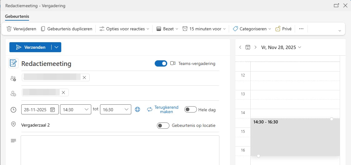 Vanzelfsprekend kun je in Microsoft Agenda ook losse afspraken delen in plaats van een volledige agenda. In de mobiele Outlook-app gebruik je hiervoor het veld Personen wanneer je een nieuwe gebeurtenis aanmaakt of via het potloodicoon bij een bestaande afspraak. Je krijgt dan twee tabbladen, Vereist en Optioneel. Op het eerste vul je de namen of e-mailadressen in van deelnemers die je absoluut bij de vergadering of afspraak wilt. Outlook houdt bij het plannen, vooral in bedrijfsomgevingen met Exchange, rekening met de beschikbaarheid van deze vereiste deelnemers. Genodigden ontvangen een uitnodiging via e-mail en antwoorden met Ja, Misschien of Ik ga niet.