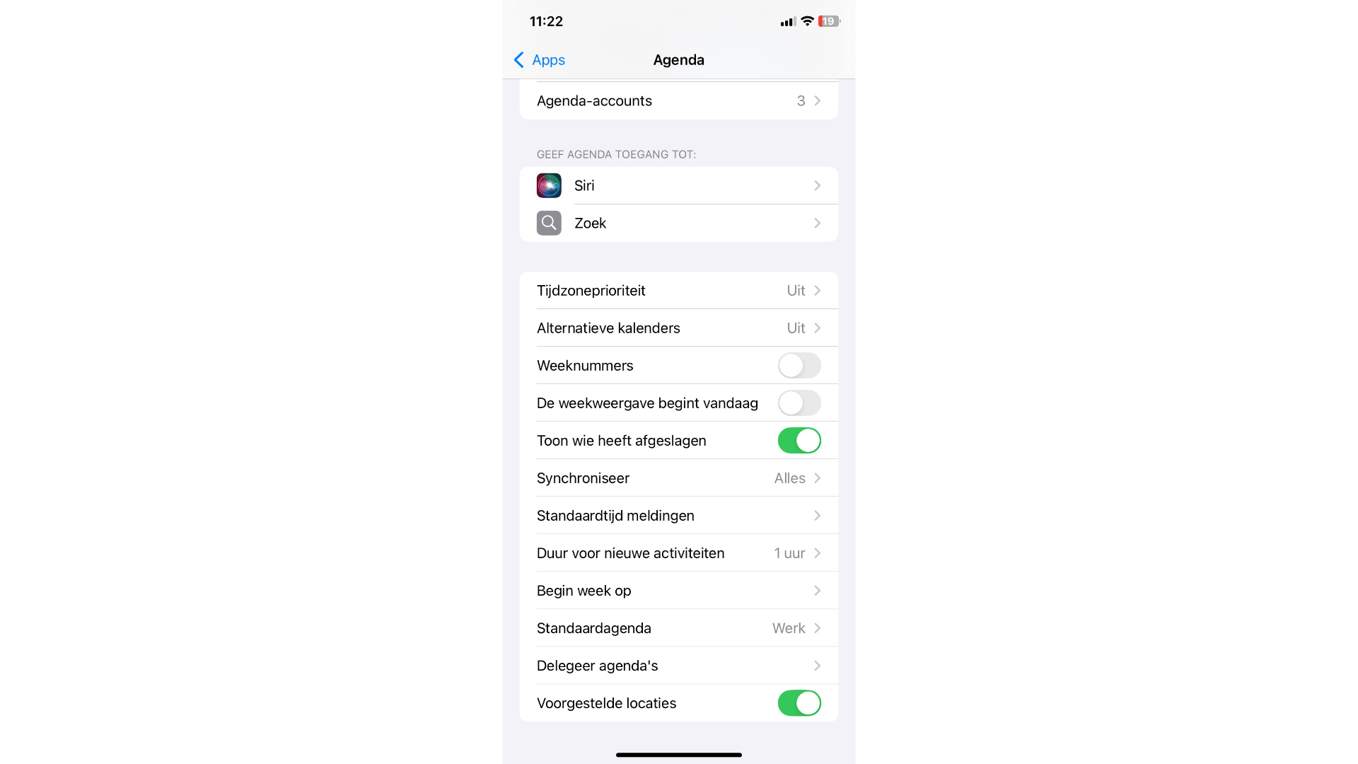 Bij Instellingen / Apps / Agenda vind je ook Synchroniseren, waar je bepaalt of je Alles synchroniseert of enkel items binnen een gekozen periode. Bij Standaardagenda kies je bovendien welke agenda, eventueel ook die van Google, de app gebruikt voor nieuwe activiteiten zonder specifieke agendatoewijzing.