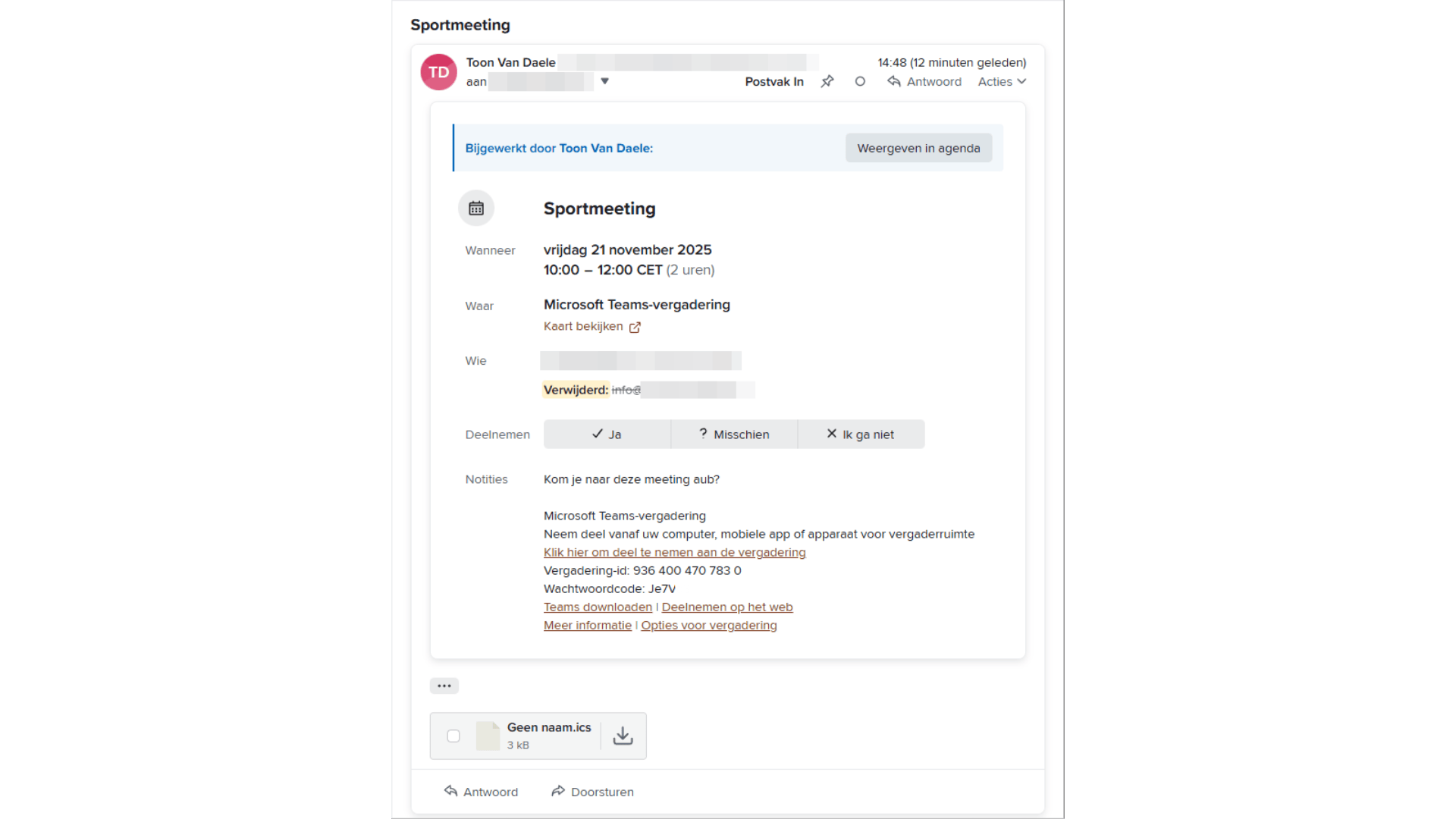 In Google Agenda dubbelklik je op een activiteit, kies je Bewerken en vul je bij Deelnemers uitnodigen de e-mailadressen in, bij Optioneel of Vereist. Voeg eventueel een bericht toe en bevestig met Verzenden. De genodigden ontvangen daarna een e-mail met knoppen om hun deelname aan te geven: Ja, Misschien of Ik ga niet. Ze kunnen de uitnodiging meteen toevoegen via Toevoegen aan agenda of Agenda bijwerken, of door de bijlage met ics-extensie te openen, bijvoorbeeld via Openen met in Windows. Een ics-bestand kan overigens ook rechtstreeks vanuit de agenda-app geïmporteerd worden.