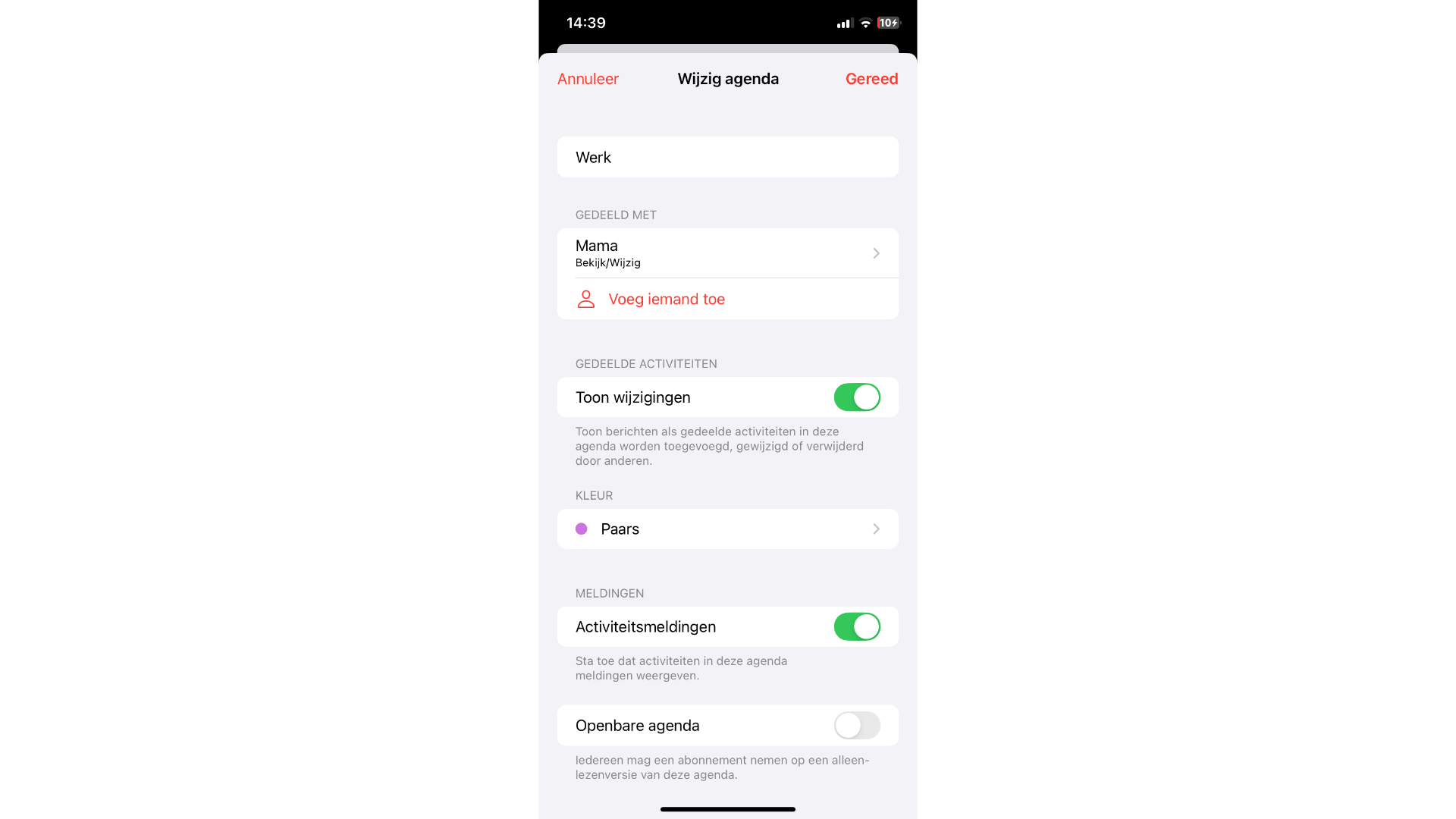 Om een willekeurige agenda te delen, open je de Agenda-app en tik je in het midden op agenda’s. Tik vervolgens op het informatiesymbool naast de beoogde agenda, zodat je in de agenda-instellingen belandt. Bij gedeeld met kun je nu Voeg iemand toe selecteren, waarna je de gewenste contactpersoon invult. Deze persoon wordt dan toegevoegd. Voor elke toegevoegde persoon kun je (ook naderhand) nog instellen of ze de agenda mogen bewerken of niet.