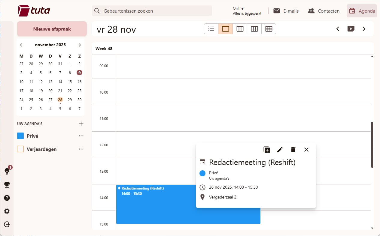 Naast de drie besproken ecosystemen bestaan nog tal van andere agenda’s. Laten we eerst kijken naar alternatieven die sterker inzetten op privacy. De agenda’s van de grote drie bieden geen end-to-end-versleuteling, omdat hun inhoud actief wordt gescand voor slimme functies als automatische vluchtherkenning en ook dataprofilering. Hecht je meer belang aan privacy, dan kun je kiezen voor Proton Calendar (www.proton.me/nl/calendar) of Tuta (www.tuta.com/nl/calendar; gratis voor 1 agenda met 1 GB). Beide zijn Europees en gebruiken sterke encryptie met end-to-end-encryptie (E2EE). Nadeel is dat ze geen CalDAV ondersteunen, waardoor integratie in andere apps niet mogelijk is.