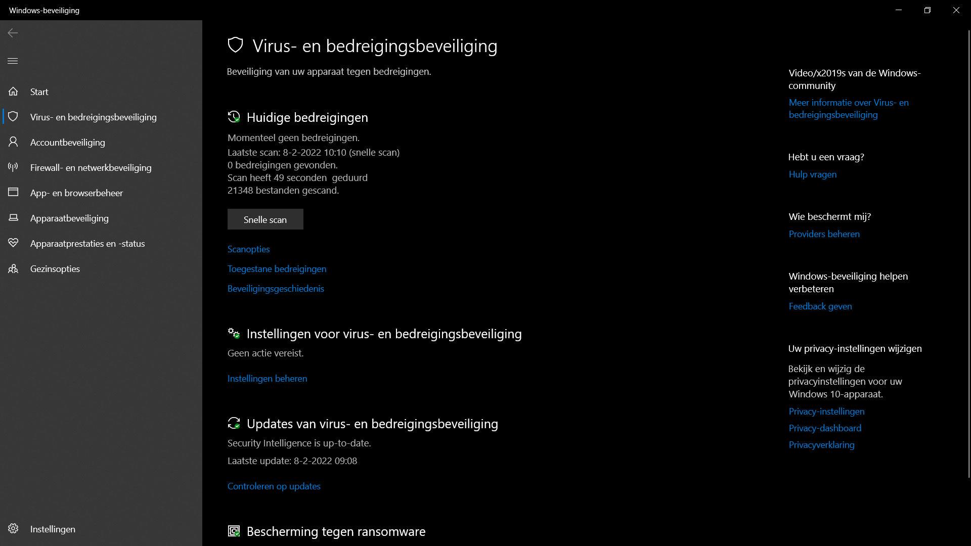 Geef Windows even de tijd om het werk te verrichten. Loop daarna ook even de instellingen na van de virus en bedreigingsbeveiliging. Zet realtime- en cloudbeveiliging aan en controleer voor de zekerheid op updates.