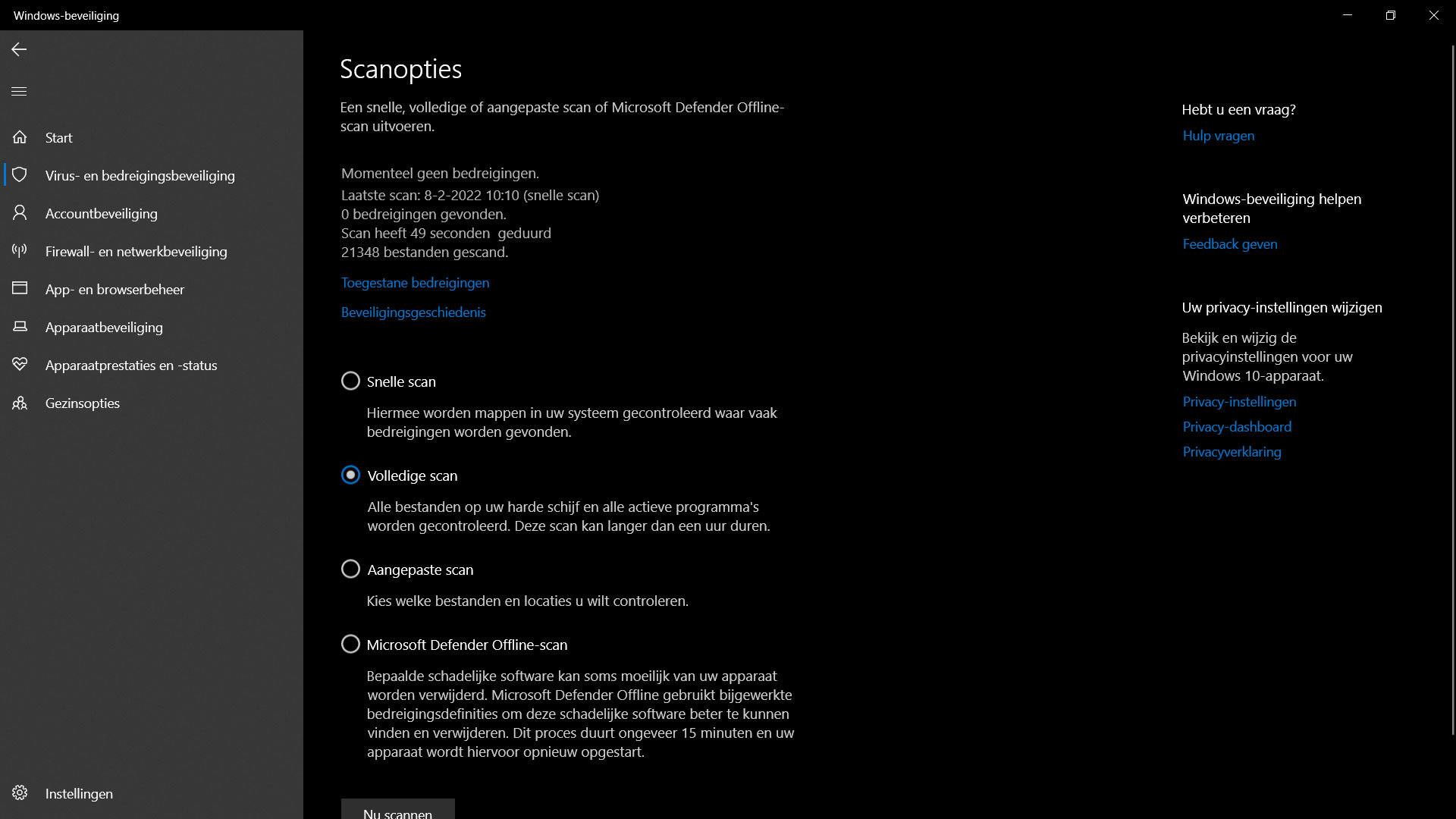 Heb al malware op je pc staan of denk je dat dat het geval is? Dan zijn er nog wat opties. Zo kun je Windows terugbrengen naar een oud herstelpunt. Wellicht zorgt dit ervoor dat de malware dan verwijderd wordt. Anders open je de eerdergenoemde Virus en bedreigingsbeveiliging. Voer een scan uit door op Scanopties te drukken. Selecteer nu Volledige scan en druk op Nu scannen.