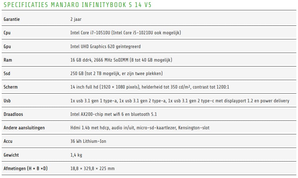 De configuratie van de Manjaro InfinityBook S 14 v5 is tijdens het bestellen vrij goed naar je wens aan te passen. De basisprijs is niet de goedkoopste, maar de meerprijs van de diverse opties valt mee. Het door ons geteste model had een Intel Core i7-processor, 16 GB geheugen en een ssd van 250 GB en daarmee kom je voor veel gebruiksscenario’s jaren toe. Zoek je een compacte Linux-laptop met uitstekende autonomie, dan zal de Manjaro InfinityBook S 14 v5 je zeker niet teleurstellen.