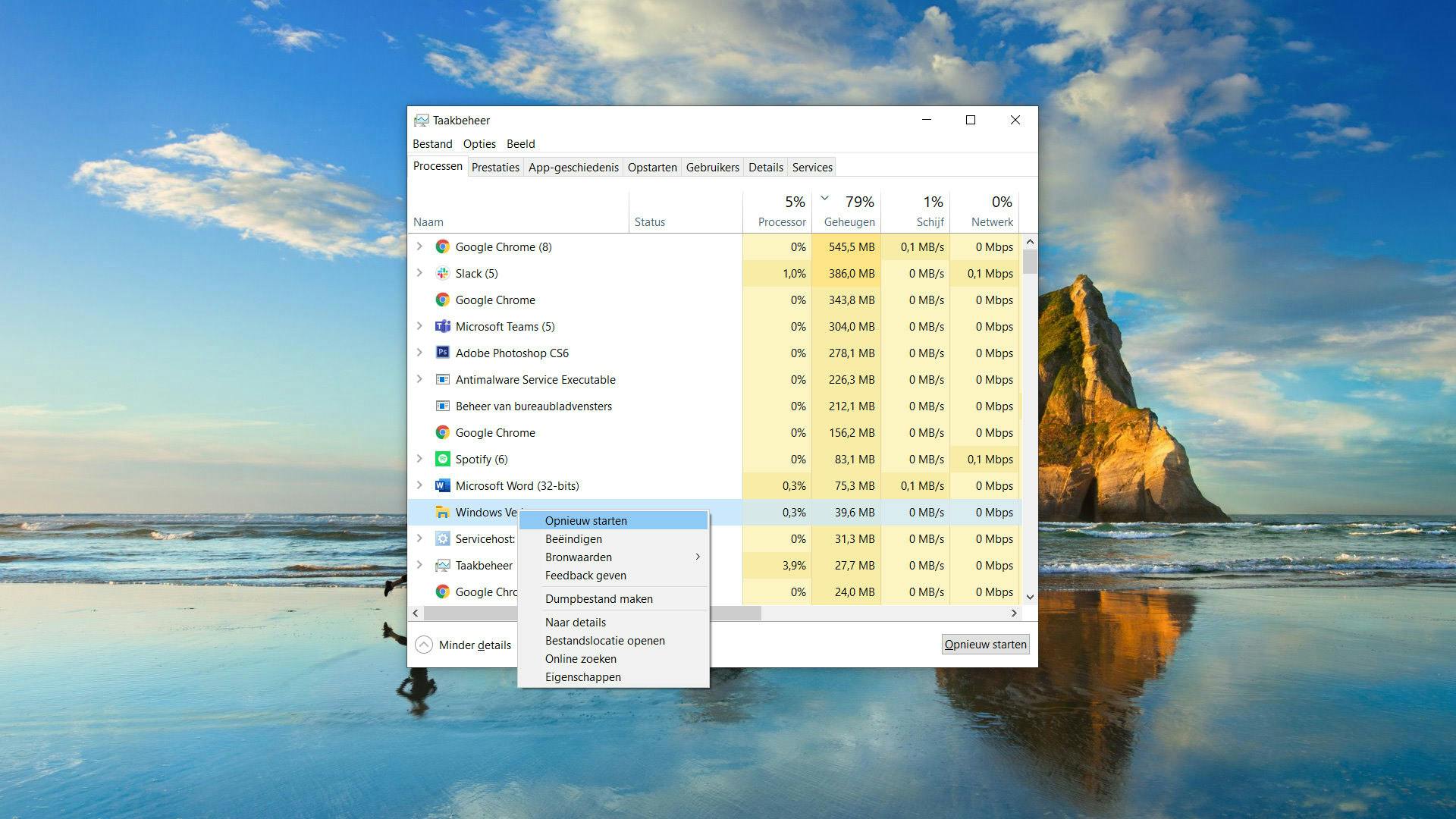 Het kan ook zijn dat de Windows Verkenner roet in het eten gooit voor het aanmaken van een map in Windows 10. Wat je kunt proberen is het opnieuw opstarten van de Verkenner. Open daarvoor Taakbeheer via Ctrl + Shift + Esc. Ga naar de tab voor processen en druk met je rechtermuisknop op Windows Verkenner. Selecteer de optie Opnieuw opstarten.