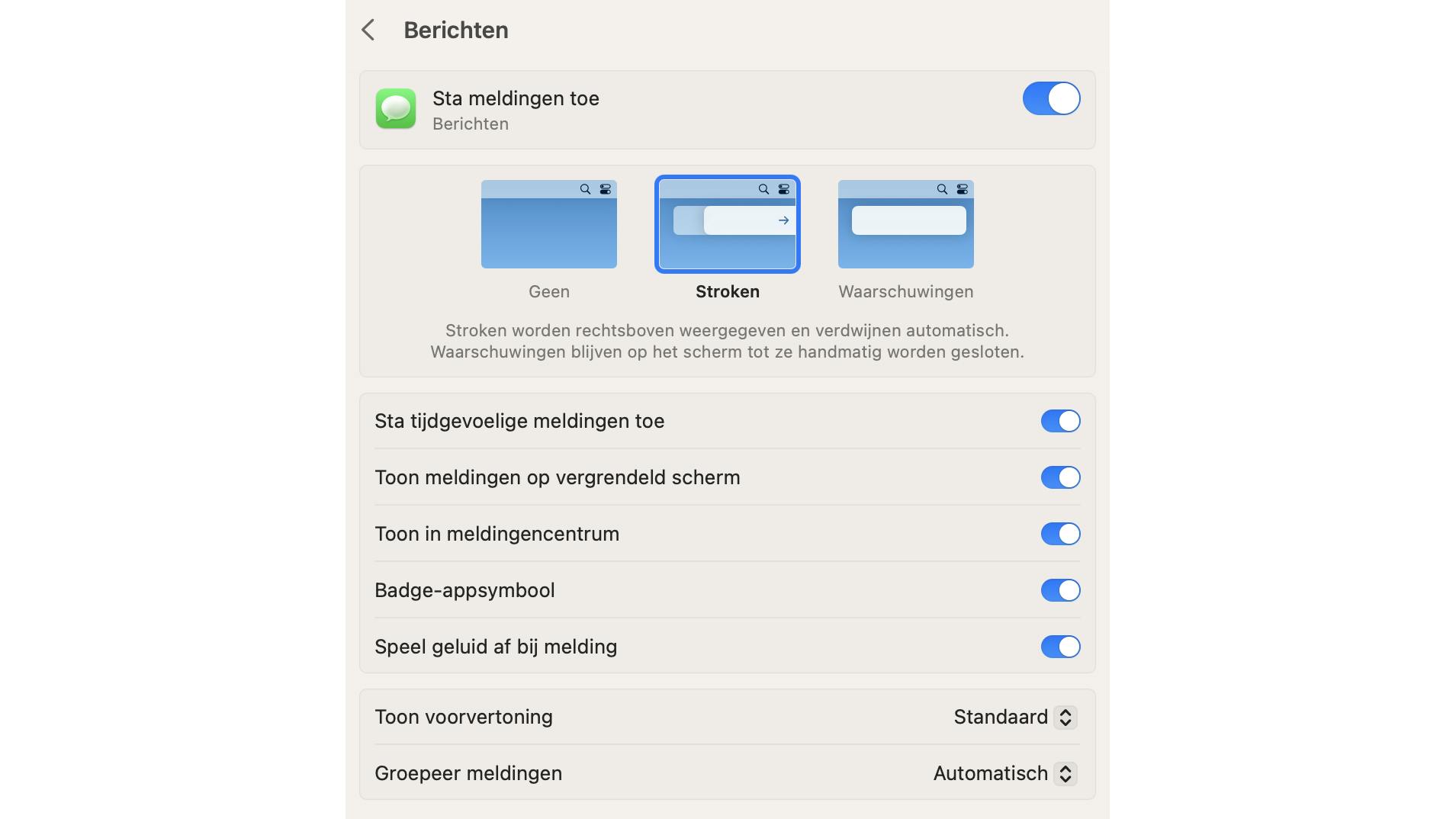 Onder Toon voorvertoning geef je aan wanneer je een melding in de rechterbovenhoek van je scherm wilt zien verschijnen als er iets gebeurt. Daaronder vind je een aantal sliders waarmee je kunt aangeven in welke gevallen je wĆ©l of juist nĆet een melding wilt zien, bijvoorbeeld als je je scherm hebt gedeeld voor een presentatie.