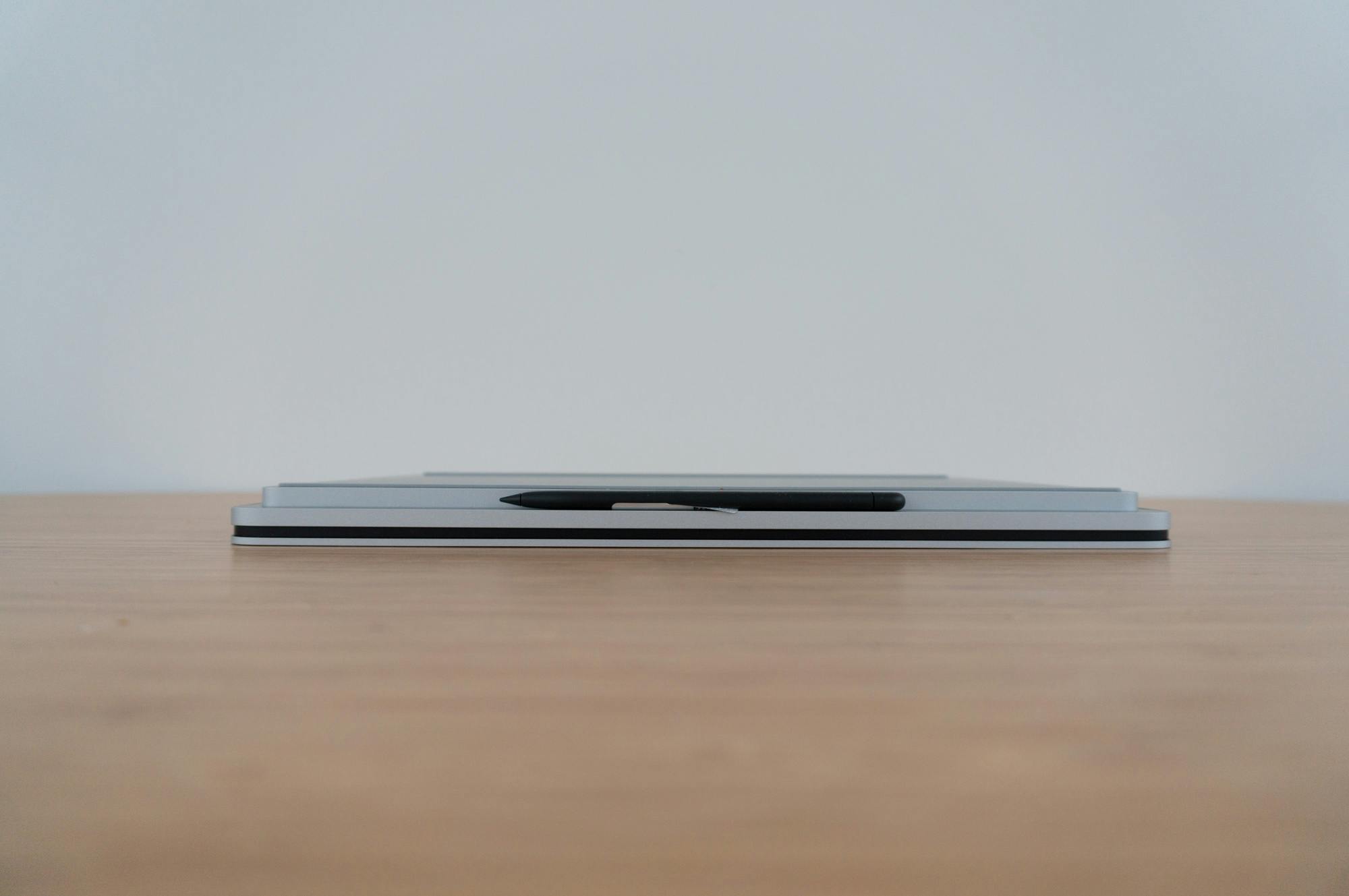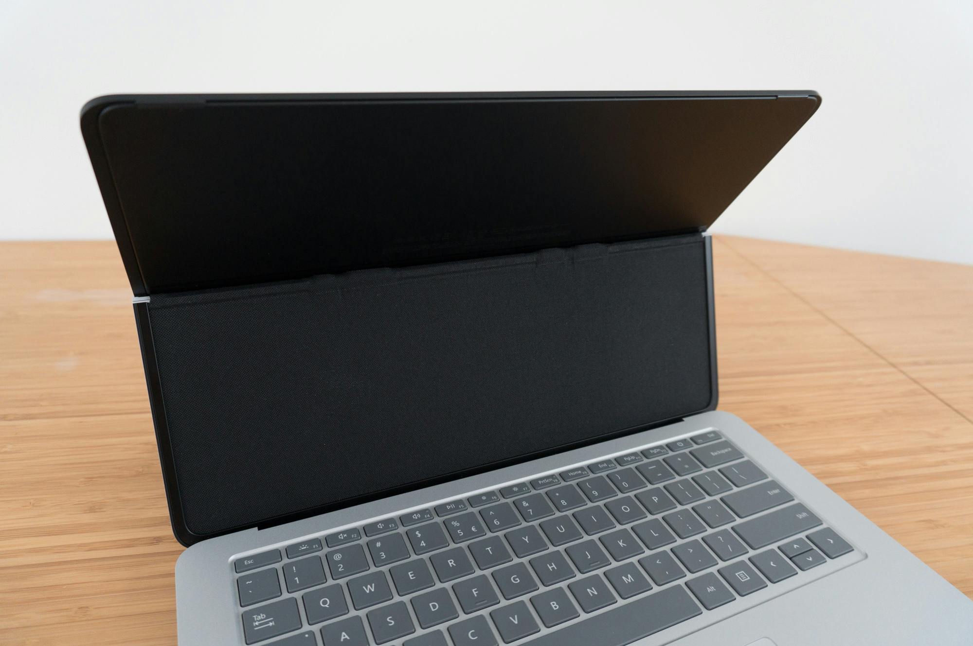 Je kunt het scherm ook dichterbij jezelf zetten over het toetsenbord heen. Er zit in de behuizing een magneet net voor het toetsenbord waardoor het geheel in deze stand vergrendelt. Deze stand is net als de tabletstand handig voor bijvoorbeeld het kijken van video's of tekenen met de Surface Slim Pen 2.