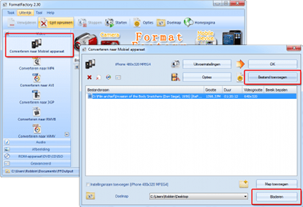 Start FormatFactory en kies onder Video voor Converteren naar mobiel apparaat. Onder Apple iPhone & iPod vindt u verschillende indelingen waarmee deze apparaten overweg kunnen. Wij kiezen in dit voorbeeld voor iPhone 480x320 MPEG4. Een andere optie voor de iPhone is iPhone 320x240 MPEG4. Hiermee wordt het bestand compacter, maar de kwaliteit lager. Bevestig met Ok en klik op Bestand toevoegen. Wijs nu het bestand aan dat u wilt omzetten naar de iPhone-indeling. Het originele filmbestand blijft onaangetast, u krijgt er een bestand voor de iPhone bij. Het is mogelijk om meerdere bestanden direct na elkaar om te zetten. Klik achter Doelmap op Bladeren en geef aan waar u het iPhone-bestand wilt opslaan. Het bureaublad is een goede keuze, omdat u het eindresultaat daar eenvoudig terugvindt. Klik rechtsboven in beeld op Ok om de film(s) om te zetten.