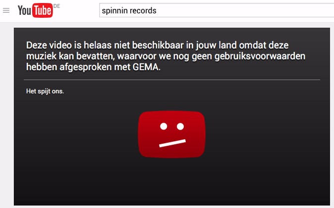 Een melding die in Duitsland veel voorkomt op YouTube. Het label, de auteursrechtendienst GEMA en YouTube hebben geen afspraken gemaakt over een licentie.