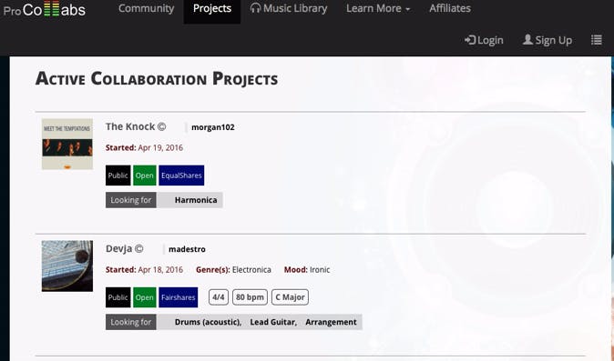 Kompoz is vooral gericht op rock- en jazzmuziek. Een site die meer gericht is op elektronische stijlen, is Splice. Deze dienst heeft bovendien een deal met Loopmasters en zodra je je inschrijft, kun je binnen Splice gebruik maken van 700 duizend loops uit hun catalogus. Met Splice kun je ook samen aan projecten werken. Als je Logic Pro X, Ableton Live, FL Studio of GarageBand gebruikt, bekijk je deze projecten in Splice en zie je welke bewerkingen andere gebruikers hebben gedaan. Op het moment van schrijven is Splice nog in bètamodus. ProCollabs is een andere vorm van samenwerken. Hier vind je iets specifiekere projecten dan op Kompoz en zijn gebruikers vaak alleen op zoek naar een bepaald persoon voor bijvoorbeeld een gitaarsolo of achtergrondzang.