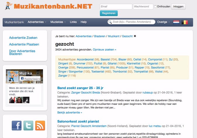 Muzikantenbank.net heeft veel advertenties van muzikanten die andere muzikanten zoeken.