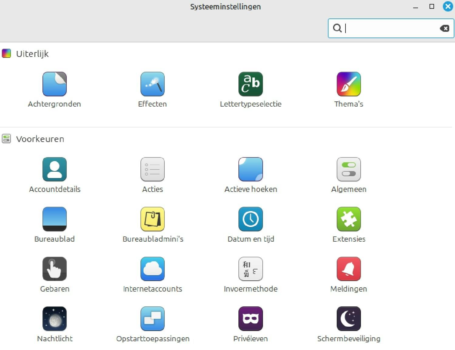 Een belangrijk pluspunt van Linux Mint is de mogelijkheid om de gebruikersomgeving tot in detail naar je hand te zetten. Dat doe je via Menu, Voorkeuren. Bepaal hier onder meer het bureaublad, de pictogrammen en kies een thema, waarmee je het uiterlijk van Linux Mint in één keer aanpast, vergelijkbaar met Windows.