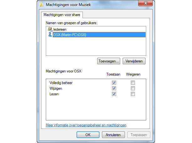 Nu u de bestandsdeling in Windows hebt ingeschakeld, moet u nog aangeven welke mappen u via uw netwerk wilt delen. Windows 7 is voorzien van een speciale wizard die dit onderdeel gebruiksvriendelijker maakt, maar opvallend genoeg maakt hij het ook wat omslachtiger. Klik in Windows Verkenner met de rechtermuisknop op het station of de map die u wilt delen en vervolgens op Delen met / Geavanceerd delen.... In het venster dat verschijnt, klikt u op de knop Geavanceerd delen. Plaats een vinkje bij Deze map delen en geef de map een zogenaamde 'sharenaam', bijvoorbeeld Muziek. Standaard heeft de gebruikersgroep Iedereen leestoegang. U kunt iedereen volledige toegang geven, maar dat is uiteraard niet veilig. Wanneer u een speciaal gebruikersaccount hebt aangemaakt, zoals we in de vorige tip het account 'OSX' tot leven hebben geroepen, dan kunt u dit account rechten geven. Klik op Machtigingen / Toevoegen en typ OSX (of de eventuele andere naam van het aangemaakte account) bij Geef objectnamen op en klik op Namen controleren. Als de naam is gevonden, klikt u op OK. U klikt nu op het account OSX en plaatst voor alle opties een vinkje bij Toestaan (voor zover u deze zaken ook echt wilt toestaan, uiteraard). Klik twee maal op OK en vervolgens op Sluiten. Het bewuste station of de map is nu gedeeld en beveiligd met een wachtwoord.