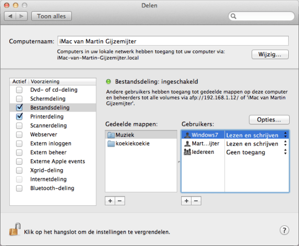 Uiteraard dient u ook wat voorbereidingen te treffen binnen OS X. Klik op Systeemvoorkeuren en vervolgens op Delen. In het venster dat nu verschijnt, klikt u op Bestandsdeling. Een prettige eigenschap van OS X is dat u niet naar uw IP-adres hoeft te zoeken, dit wordt namelijk automatisch in dit venster getoond. Noteer dit adres wederom, zodat u het kunt ingeven binnen Windows. Klik op de knop Opties en vervolgens op Deel bestanden en mappen via SMB (Windows). Selecteer vervolgens het account waarvoor u het delen wilt inschakelen. Klik op Gereed en vervolgens op het plusteken in het deelvenster Gedeelde Mappen om aan te geven welke mappen u wilt delen. Nu kunt u per map aangeven wie lees- en schrijfrechten heeft. Het werkt uiteraard het snelst als u iedereen lees- en schrijfrechten geeft, zodat iedereen binnen het netwerk zonder probleem door de bestanden op de Mac kan bladeren. Dat is handig, maar het levert natuurlijk wel risico's op. Het is daarom verstandig om het plusteken aan te klikken en een gastgebruiker aan te maken voor OS X, bijvoorbeeld met de naam 'Windows7', en daar een wachtwoord aan te koppelen. Op die manier kunt u alleen lees- en schrijfrechten toekennen aan het betreffende account, en dat is wel zo veilig.