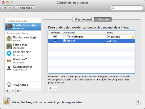 Ondanks de mogelijke problemen, kan het toch wenselijk zijn om het automatisch verbinden in te schakelen. Het is immers erg vervelend om steeds opnieuw een netwerkverbinding aan te moeten maken. Om automatisch verbinding te maken, opent u Systeemvoorkeuren, klikt u op Gebruikers en groepen en vervolgens in het verschenen scherm op het tabblad Inloggen. Hier ziet u de programma's en services die automatisch worden gestart wanneer u OS X start. Klik op het plusteken onderin en blader naar het netwerkstation. Klik op één van de gedeelde mappen om hem toe te voegen. U hoeft dit uiteraard maar voor één map te doen, want hierdoor wordt OS X gedwongen om verbinding te maken, waardoor de hele netwerkschijf automatisch in Finder verschijnt.
