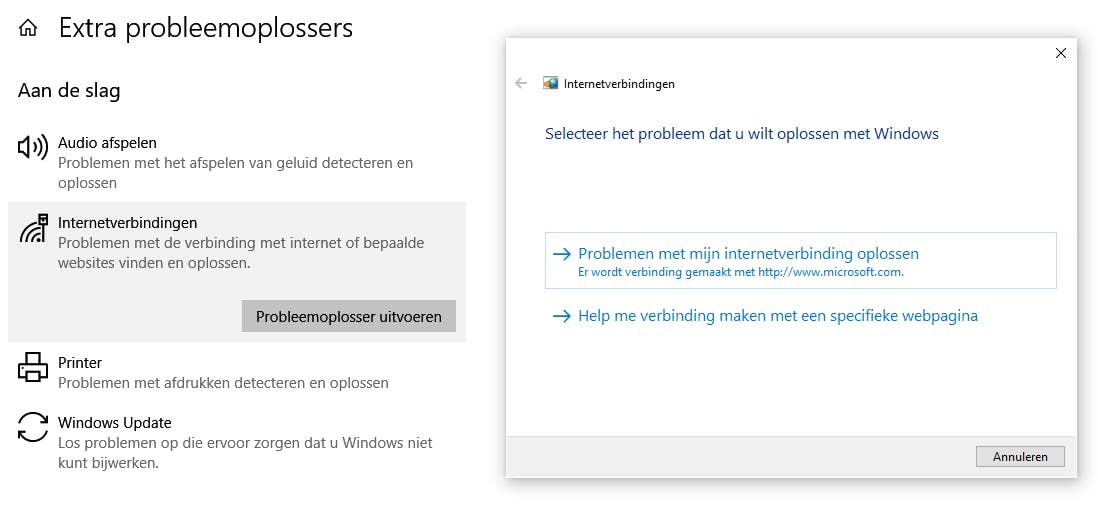 De meeste probleemoplossers zitten in de Instellingen. Open daar Bijwerken en beveiligen en dan zie je in de linker balk de knop Problemen oplossen. Probeer eerst de Aanbevolen probleemoplossing. Daarna kun je de knop Extra probleemoplossers gebruiken en dan kom je bij een hele vloot assistenten voor typische problemen met audio afspelen, internetverbindingen, printergebruik, Windows-updates, audio opnemen en nog veel meer. In dit voorbeeld kies je Internetverbindingen en je start de probleemoplosser. De meeste probleemoplossers doen automatisch hun ding, maar bij sommige moet je kiezen uit de voorgestelde oplossingen.