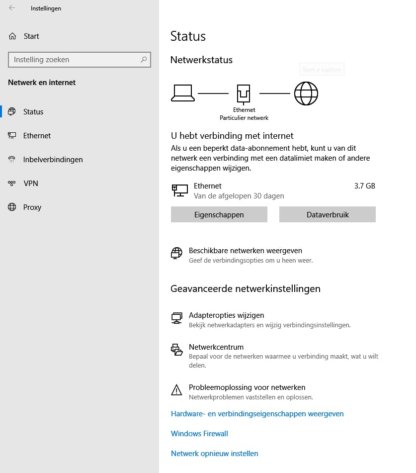 Geeft dit niet het gehoopte resultaat, dan maak je schoon schip met alle huidige netwerkinstellingen. Het lijkt dan alsof de computer net nieuw uit de winkel komt. Ga naar Windows Instellingen via Windows-toets+I en klik op Netwerk en internet. In de linkerkolom selecteer je de optie Status en daar vind je de link Netwerk opnieuw instellen. Hierdoor zal Windows alle netwerkadapters verwijderen en opnieuw installeren. Ook de oorspronkelijke netwerkonderdelen worden terug naar de fabrieksinstellingen gebracht. Dat betekent dat alle componenten voor vpn-software die je ooit hebt geïnstalleerd worden verwijderd.