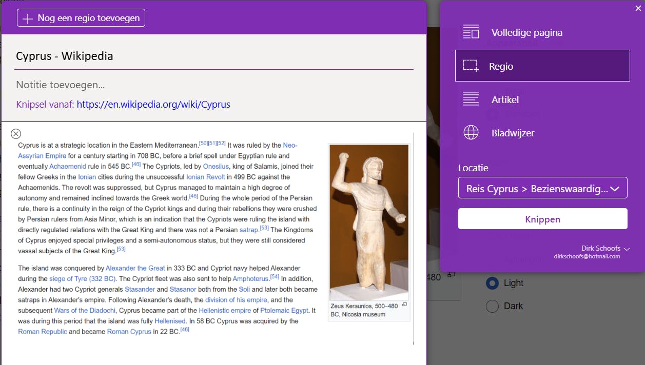 Om Web Clipper te installeren, ga je eerst naar www.onenote.com/clipper. Daar klik je op de knop OneNote Web Clipper installeren. Daarna volg je de instructies afhankelijk van de browser die je het liefst gebruikt, want dit hulpmiddel werkt met een browserextensie. De eerste keer dat je deze tool gaat gebruiken, moet je je aanmelden met je Microsoft-account zodat Web Clipper de verbinding kan maken met je OneNote-app. Vervolgens kies je of je een clip wilt maken van de volledige webpagina, een bepaalde regio, een artikel of de bladwijzer. Tot slot geef je aan in welk OneNote-notitieblok en op welke pagina de clip moet worden opgeslagen.