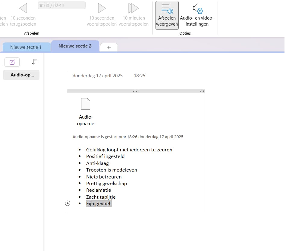 Veronderstel dat je iemands woorden opneemt, terwijl je ondertussen in bulletpoints de onderwerpen noteert die in diens betoog aan bod komen. Vanaf dan wordt de audio met de bulletpoints gesynchroniseerd. Wanneer je achteraf de tekst beluistert en je klikt op de knop Afspelen weergeven, markeert OneNote automatisch de bulletpoints die je hebt getypt.