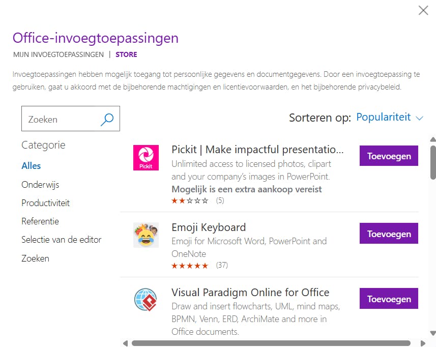 In de online versie van OneNote is het gemakkelijk om de add-ons te beheren. In de online versie noemen ze dit invoegtoepassingen. Klik in het tabblad Invoegen op de knop Office-invoegtoepassingen. Dan kom je in een venster met twee tabbladen: Mijn invoegtoepassingen en Store. De eerste dient om de invoegtoepassingen te beheren die je al hebt geactiveerd. Wil je een geïnstalleerde add-on verwijderen, dan klik je er met de rechtermuisknop op en kies je de opdracht Verwijderen. In het tweede tabblad kun je invoegtoepassingen zoeken in de Microsoft Store. Als je er een interessante hebt gevonden, dan klik je op de knop Toevoegen.