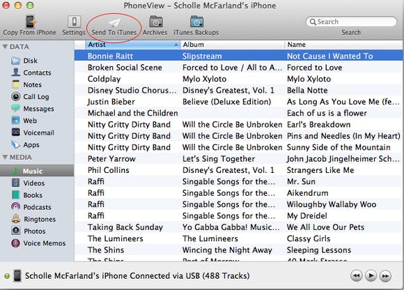 Plug gewoon je apparaat in, start PhoneView, selecteer het soort media dat je wilt herstellen, en – als het bijvoorbeeld om muziek gaat – kopieer het rechtstreeks naar je iTunes library door op Send To iTunes te klikken.