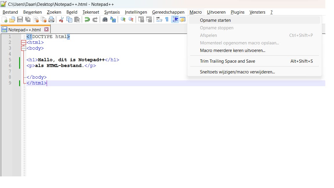Via Macro - Opname starten begin je een opname. Elke taak die je uitvoert tot je weer op Opname stoppen klikt, wordt opgeslagen. Daarna kun je een ander bestand openen en via Afspelen het nieuwe document aanpassen met de regels uit de macro. Zo hoef je maar één keer een serie taken uit te voeren, en Notepad++ doet voortaan de rest.